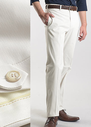 夏のオンオフに重宝するアイボリーカラーのスラックス。