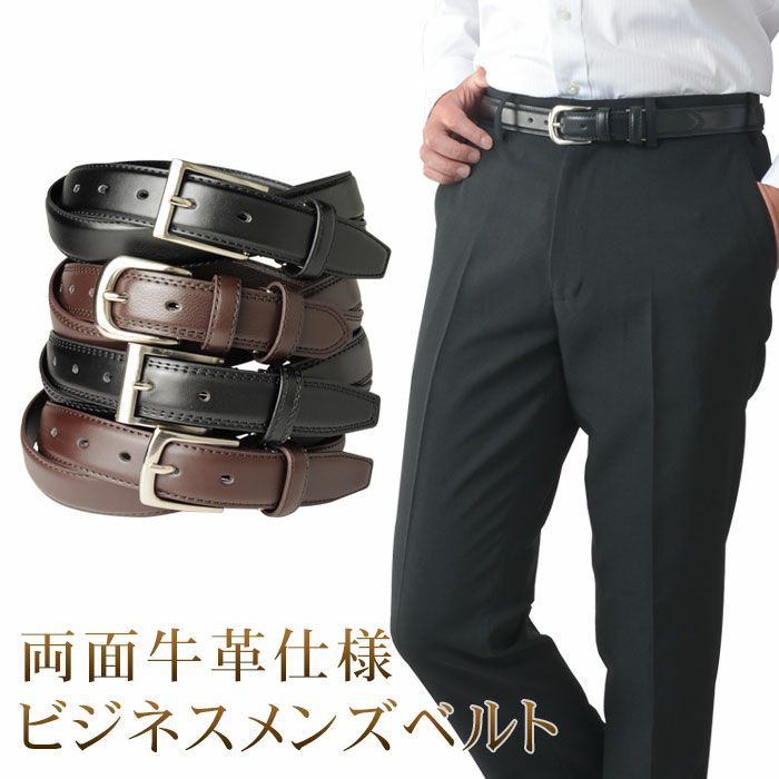 両面牛革を使用した上品なビジネスベルト。定番のブラック、ブラウン、チョコブラウンの3カラー。ベルトカット対応商品となります。