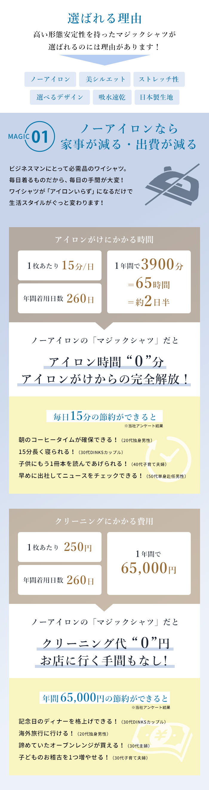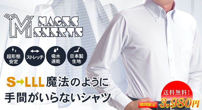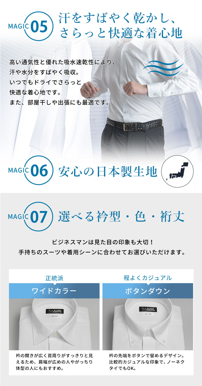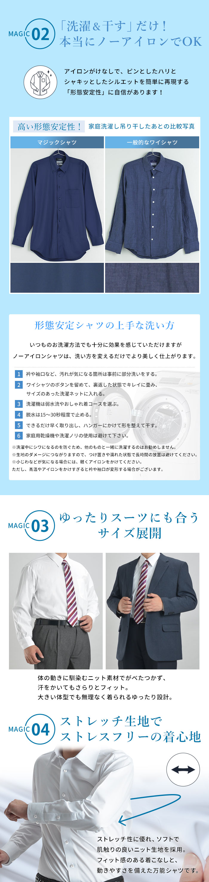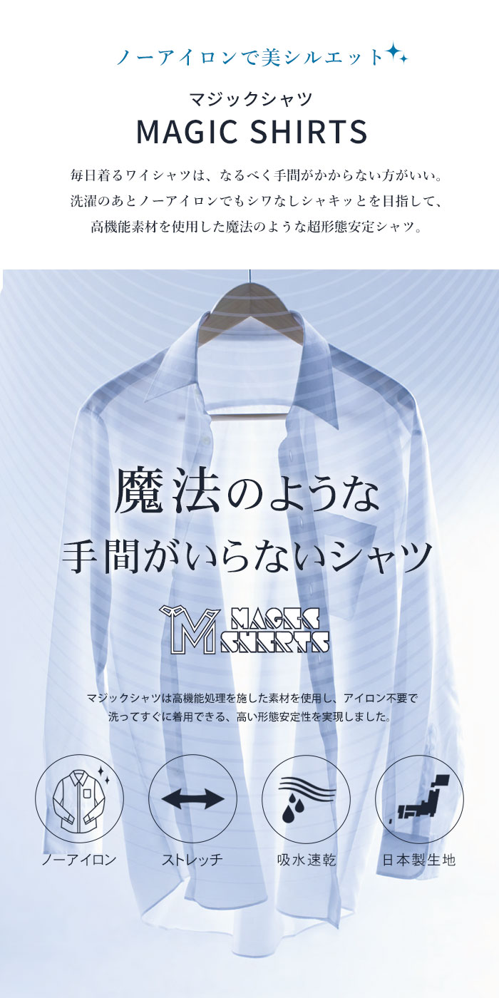マジックシャツは当社のオリジナル企画による人気商品となりますため、「価格と品質の最適化」を図り、以前お買い求めいただいた商品とデザインや素材が異なる場合がございます。長くご愛用いただけるよう努めてまいりますので、何卒ご理解の程お願い申し上げます。