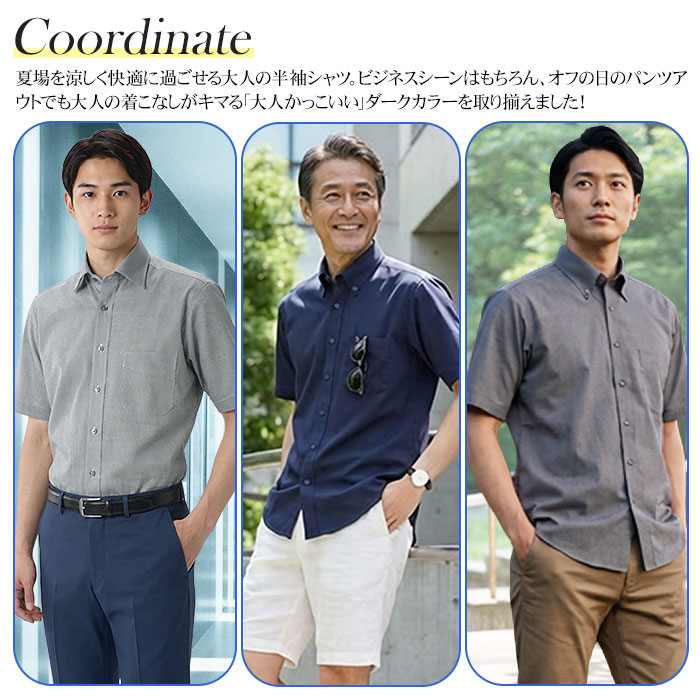 夏場を涼しく快適に過ごせる大人の半袖シャツ。 シワになりにくい形態安定(形状安定)加工で使い勝手が良く、ビジネスシーンはもちろん、オフの日のパンツアウトでも大人の着こなしがキマる「大人かっこいい」ダークカラーを取り揃えました!