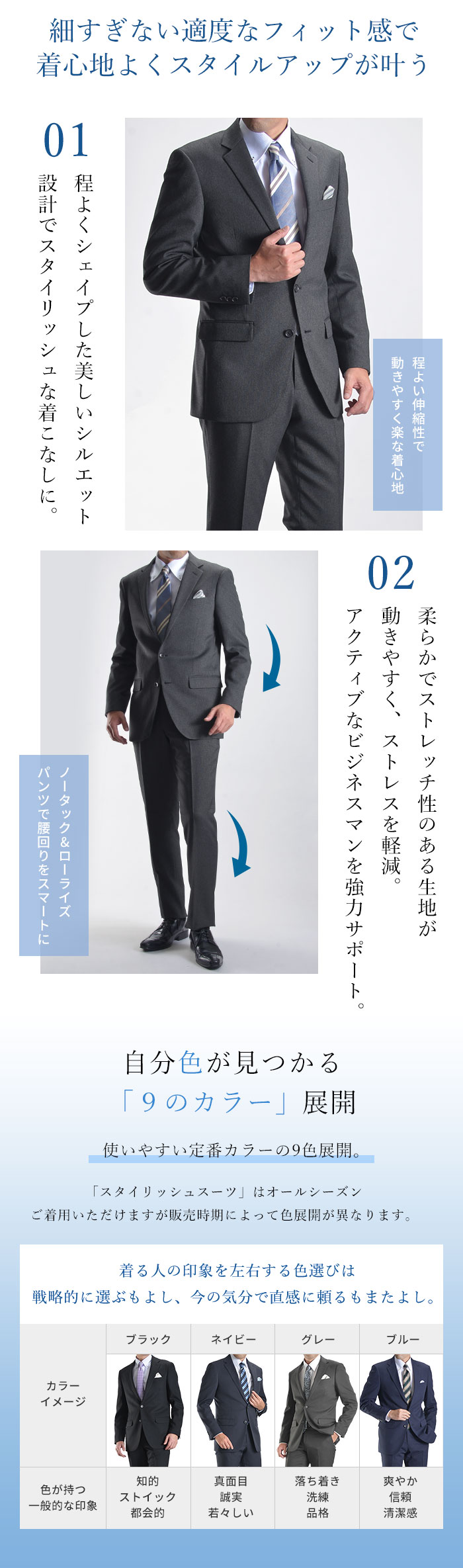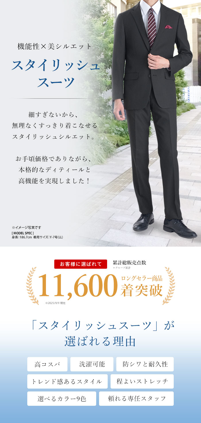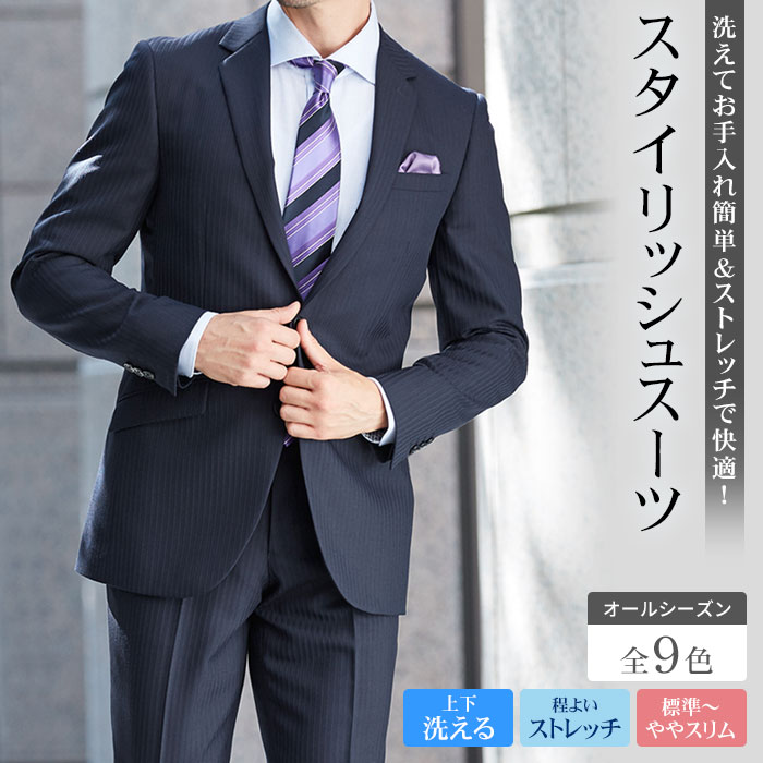2ツボタン シングルスーツ ノッチドラペル センターベント 背抜き仕立て ナチュラルストレッチ素材 袖3ツボタン ウォッシャブル機能