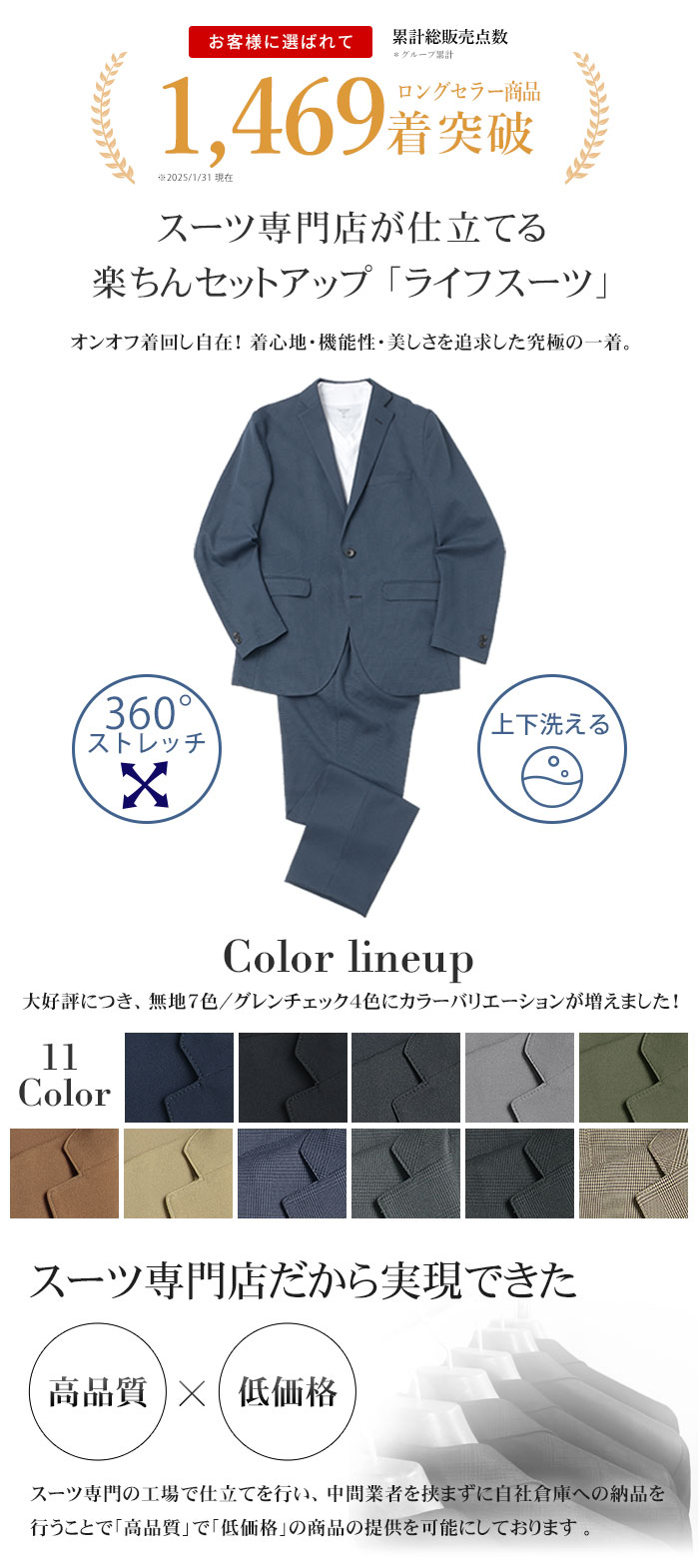 ノッチドラペル 2ツボタン シングル フラップポケット ウォッシャブル仕様 センターベント 右内ポケット アンコン仕立て