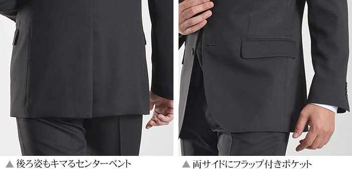 2ツ釦 シングルスーツ センターベント 背抜き仕立て フラップポケット 裏地ポケット左右付き 袖3ツ釦 ウォッシャブル仕様