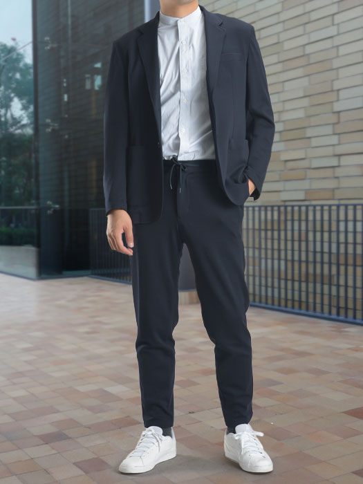 ネイビーのきれいめセットアップにスニーカーを合わせたオンオフ兼用スタイル。 上品なネイビーストライプのバンドカラーシャツを合わせました。 程よいリラックス感のある旬のコーディネートです。