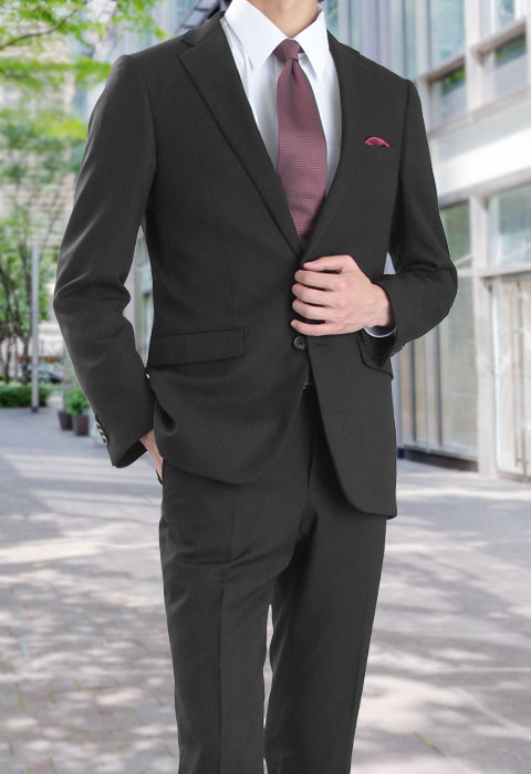 就活や会社訪問はもちろん、冠婚葬祭あらゆるシーンで着用できるブラックスーツ。
