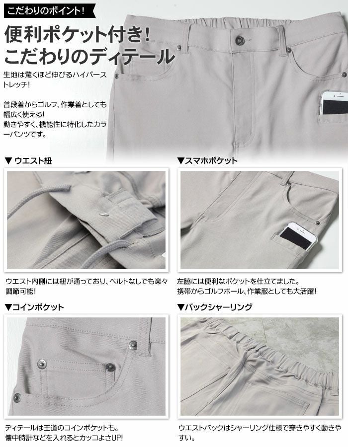 他の画像を見る メンズカラーパンツ!驚きのストレッチで楽々おしゃれ! メンズ ストレッチパンツ カラーパンツ ハイパーストレッチ スマホポケット 6ポケット カジュアルパンツ ワークパンツ ウォッシャブル 送料無料 価格 ¥ 2,480 税込 カートに入れる お気に入りに登録する